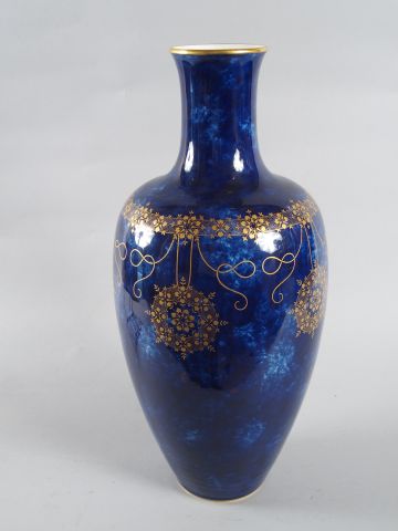 Sèvres. Vase ovoïde en porcelaine, à décor de style 1900 doré sur fond bleu nuagé. Signé et daté 1902. H. : 45 cm