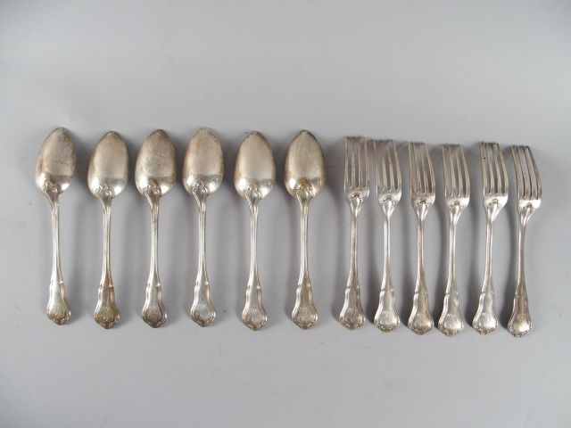 Six grands couverts en argent, poinçon Minerve, modèle violonné, feuillagé et monogrammé. Poids : 1 kg