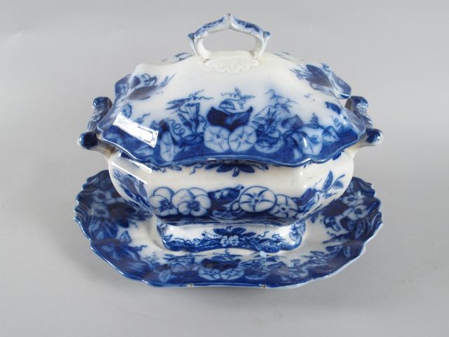 Soupière et son présentoir en faïence fine de Vieillard à Bordeaux, décor en camaïeu bleu de fleurs (égrenure). On y joint un plat ovale en porcelaine polychrome de Limoges.