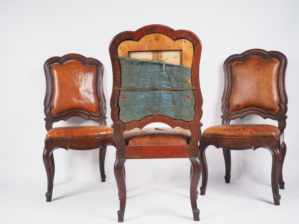 Suite de quatre chaises Louis XV en bois mouluré et sculpté, garniture de cuir (usée)