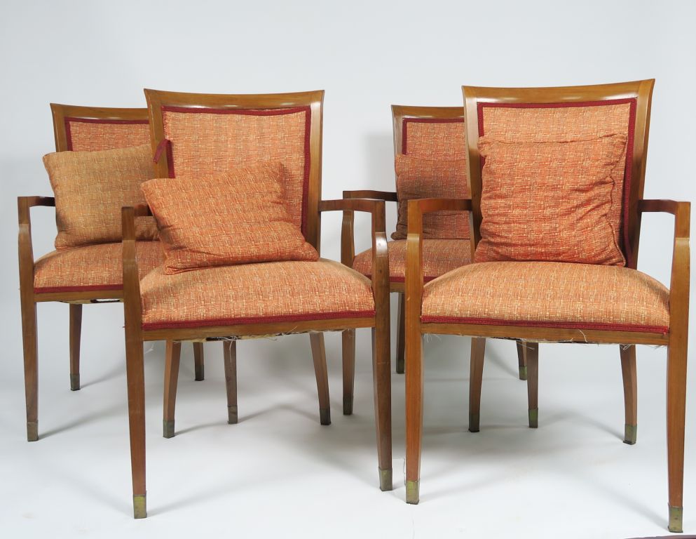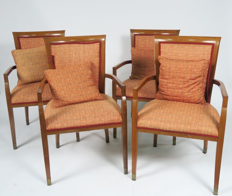 Suite de quatre fauteuils Art déco en palissandre, garniture de tissu rouge et crème.