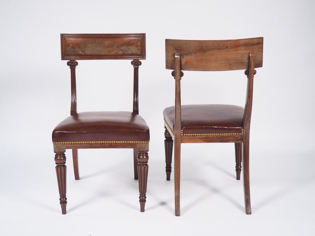 Suite de six chaises de salle à manger XIXème en acajou, dossier à bandeau et chapiteaux, pieds avant godronnés.