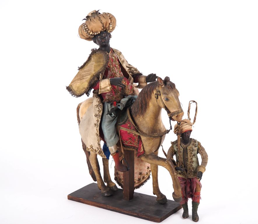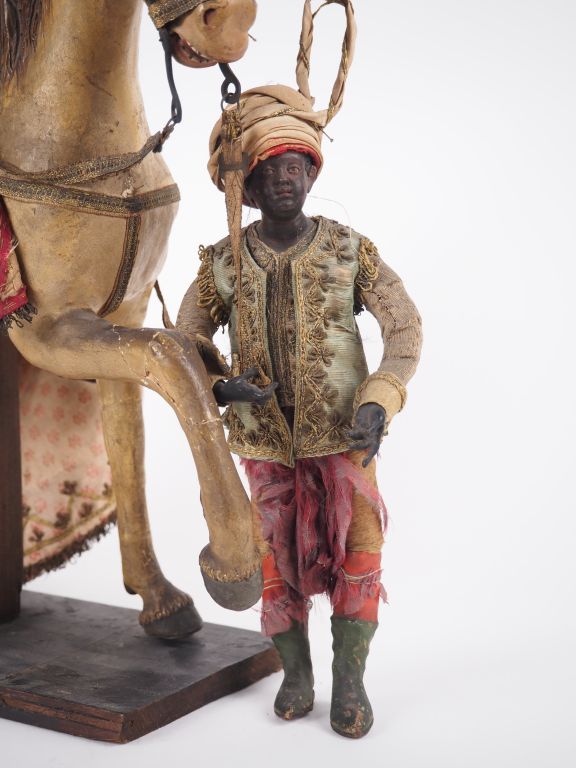Sujet Napolitain en terre cuite polychrome et soie figurant un cavalier maure et son page. Dim. 45 x 32 cm. (Accidents et manques).