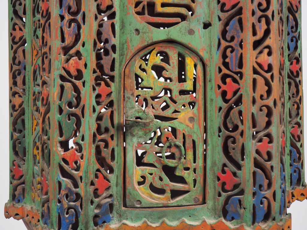 Superbe et grande lampe de mosquée ancienne en bois sculpté et ajouré à décor de rinceaux feuillagés polychromes. (accidents).