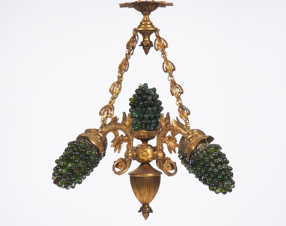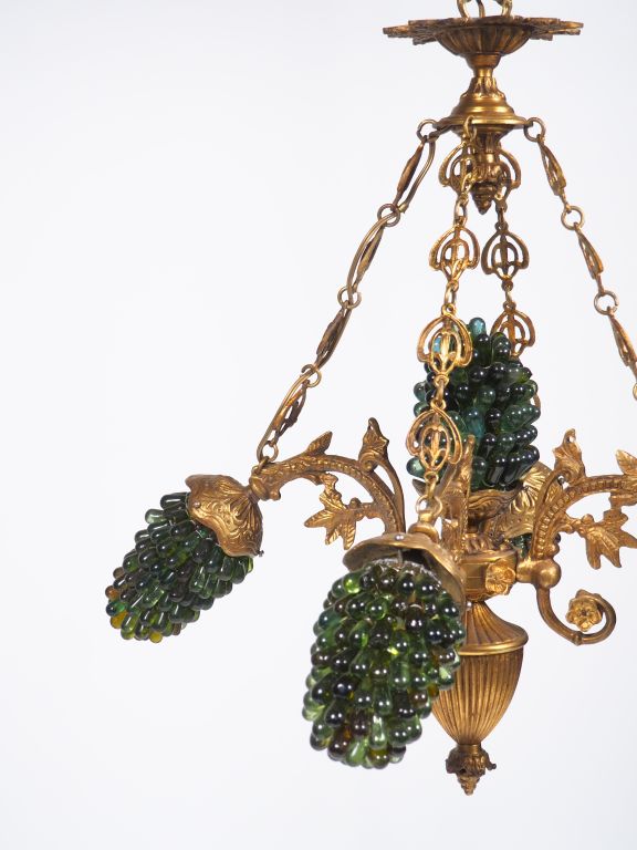 Suspension à cinq lumières en métal et verre à décor de grappes de raisin.