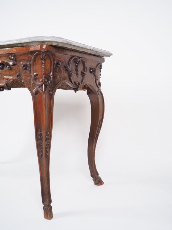 Table à gibier Régence en bois naturel mouluré et sculpté, à décor de rinceaux feuillagés, de palmette , pieds en sabot de biche, dessus marbre gris. Dim. 79 x 114,5 x 56 cm.