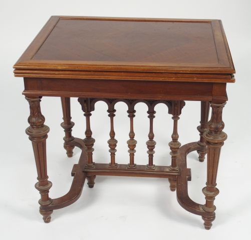 Table à jeux Napoléon III en placage de noyer, plateau se dépliant en trois parties.