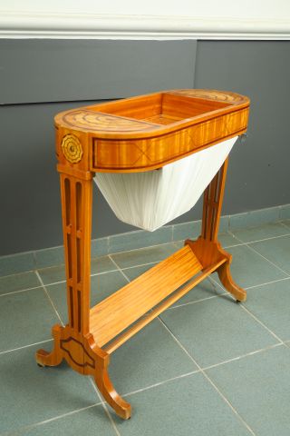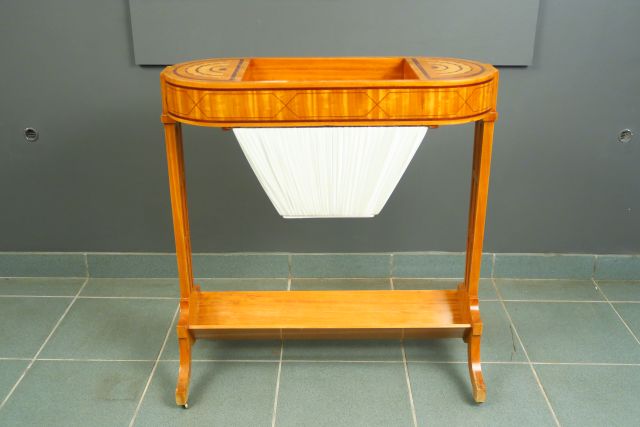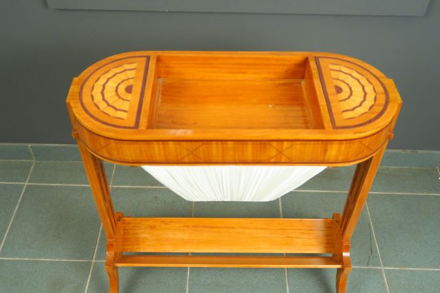 Table à ouvrage de style Louis XVI en marqueterie à décor géométriques. 72 x 67 x 27,5 cm