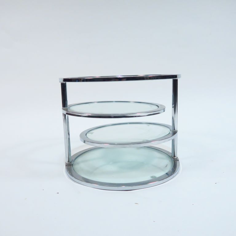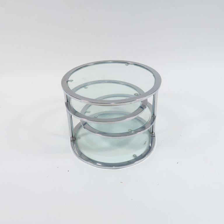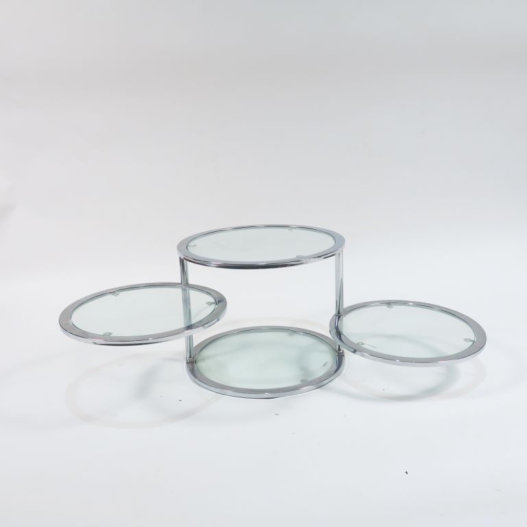 Table basse à trois plateaux articulés en métal chromé et verre.