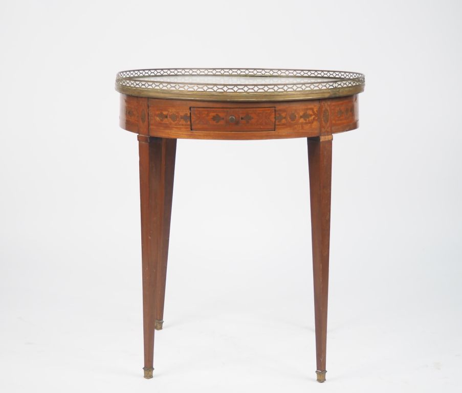 Table bouillotte de style Louis XVI en marqueterie, pieds facetés et fuselés, plateau à galerie et marbre blanc. H. 76 x 65 cm (marbre accidenté)