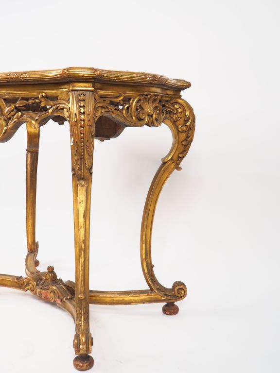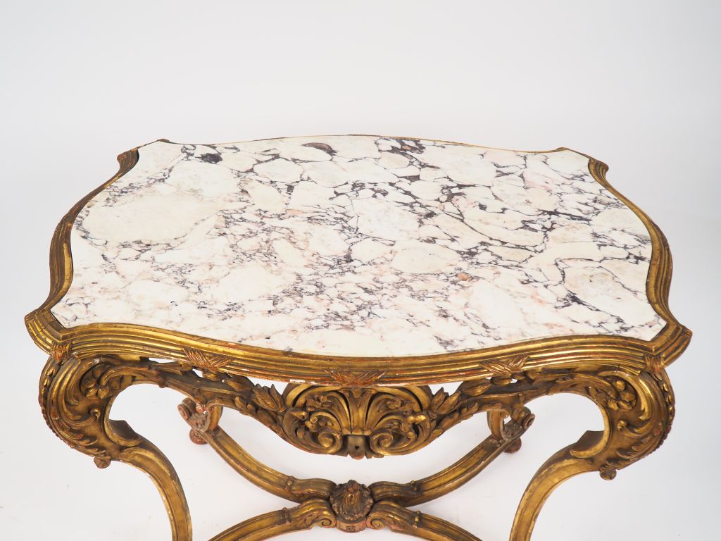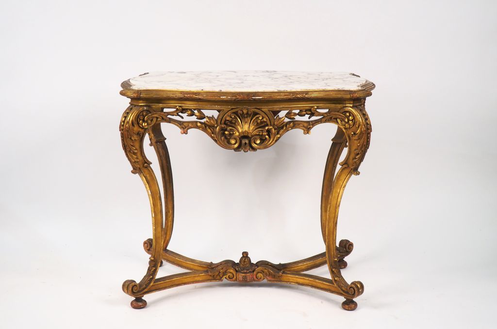 Table de milieu de style Louis XV en bois mouluré, sculpté et doré, à décor de feuilles de laurier, de coquilles et de fleurettes, piétement mouvementé, entretoise en X, dessus marbre bicolore. Dim. 90,5 x 97 x 63 cm