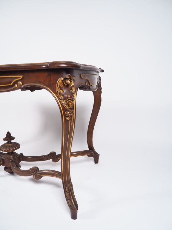 Table de milieu Napoléon III en bois mouluré, sculpté et légèrement doré à décor de coquilles et de rocaille. Entretoise en X réunie par une console. Dim.73 x 124 x 74 cm