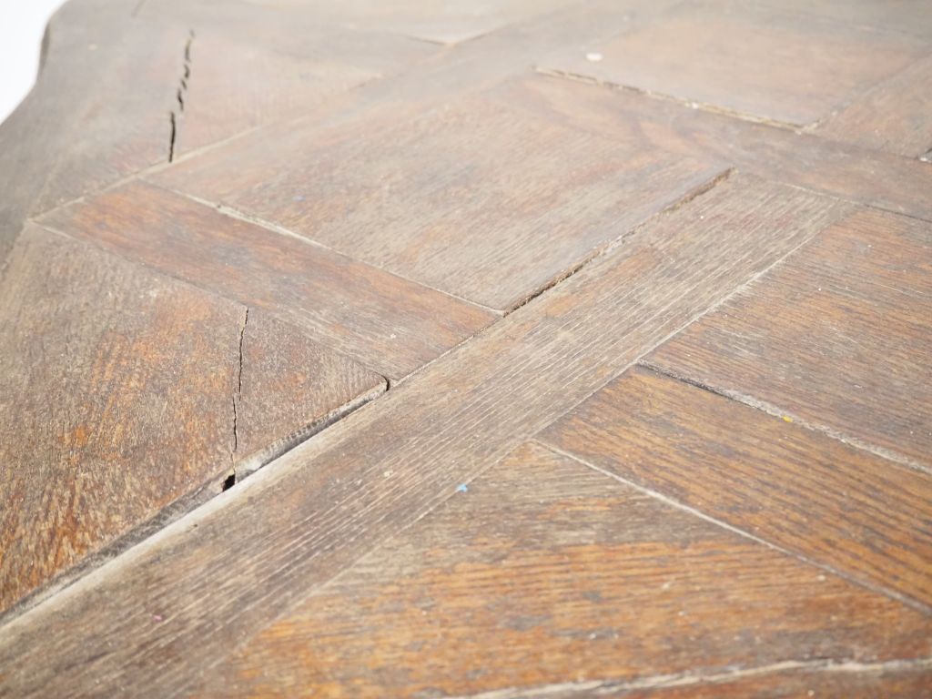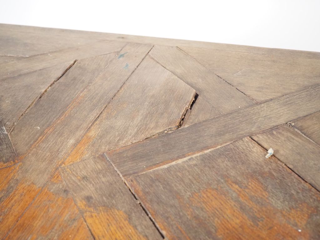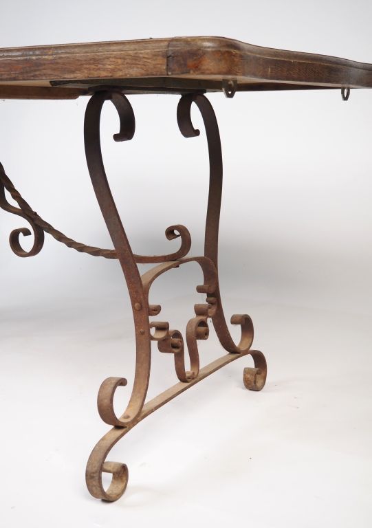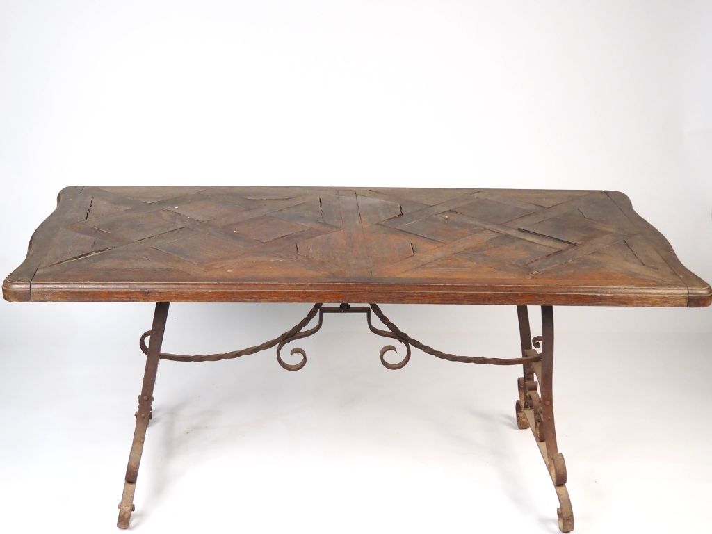 Table de salle à manger de style Louis XV, élégant piétement en fer forgé, à décor de volutes, plateau bois parqueté en chêne. Dim. 74 x 168 x 84 cm (quelques sauts de placage)