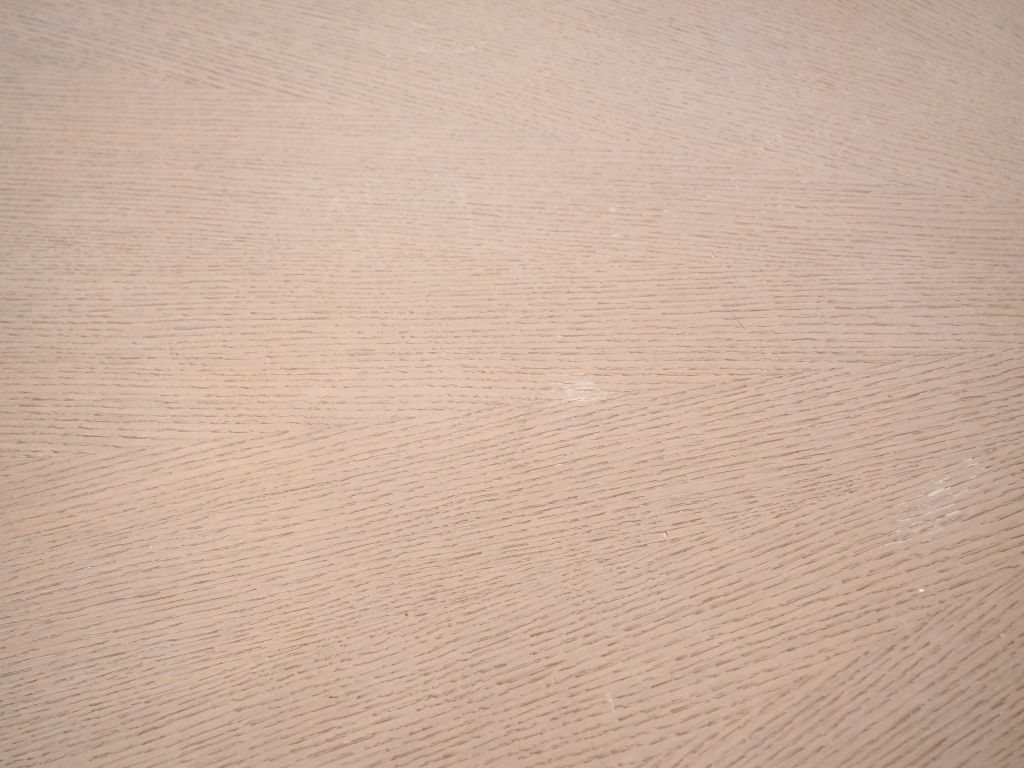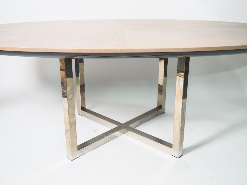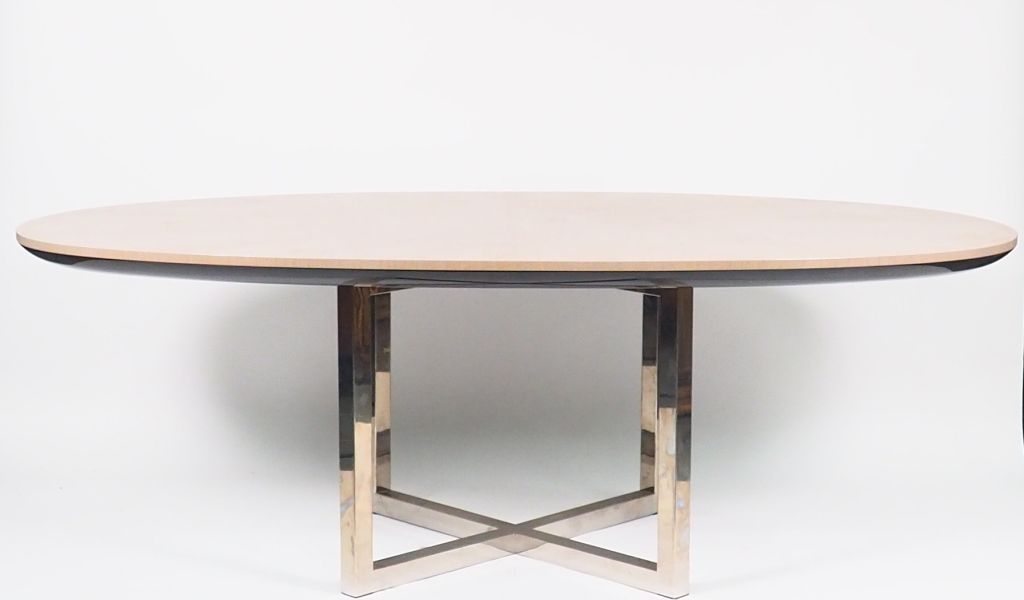 Table Design ovale, piètement chromé, plateau en bois cérusé. Dim. 220 x 110 cm.