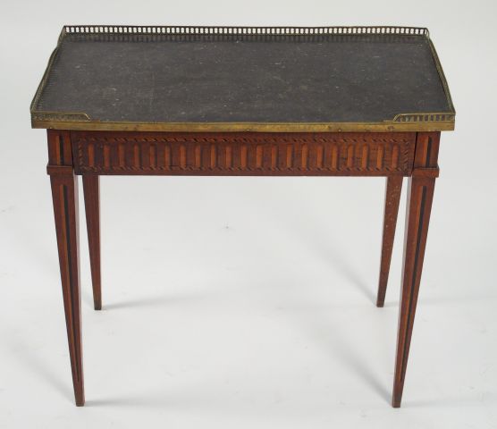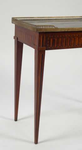 Table Louis XVI en marqueterie, à décor de cannelures en trompe l'œil, dessus marbre gris à galerie.