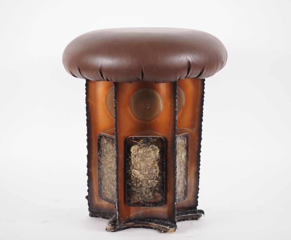 Tabouret années 60 en métal patiné et plaques de résines. H. 43 cm.