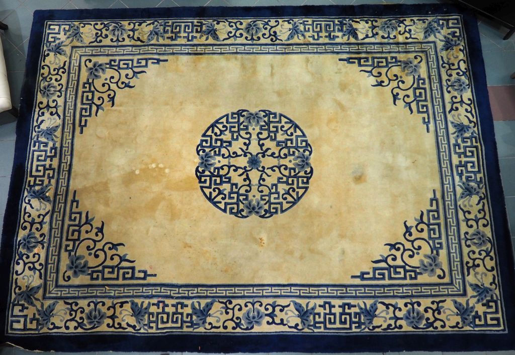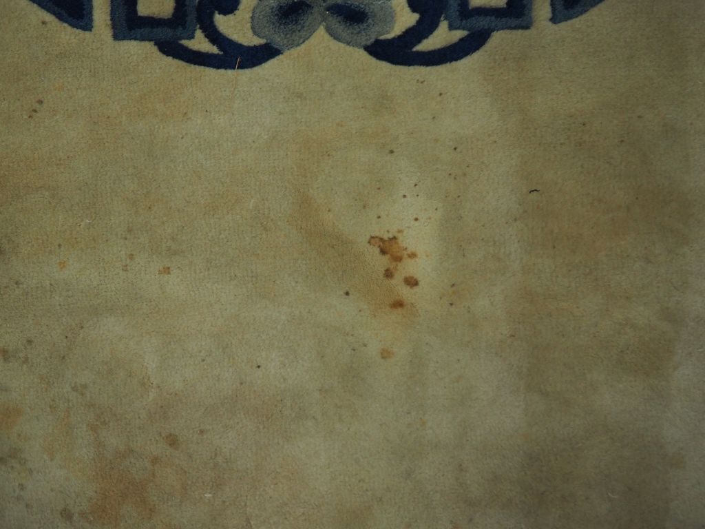 Tapis chinois XXème crème et bleu. Dim. 378 x 276 cm (traces d'humidité, tâches)