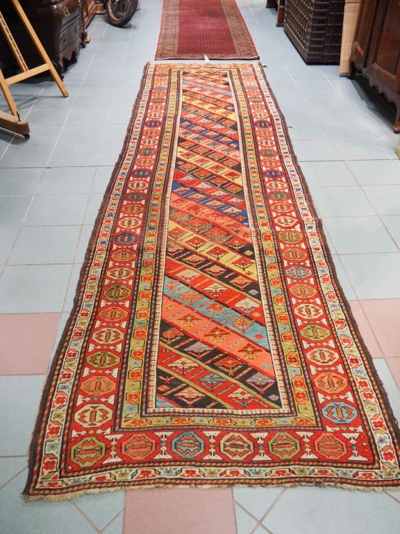 Tapis galerie à décor de motifs géométriques. Dim. 397 x 115 cm (petites usures)