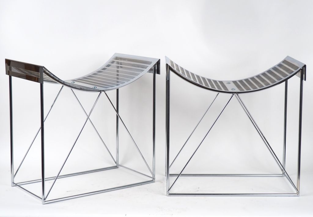 TERUAKI OHASHI (attribué à) pour Louis VUITTON Fashion Show 2018, Paris. Paire de tabourets curule en métal chromé Dim. 48 x 30 cm portent l'étiquette Louis Vuitton