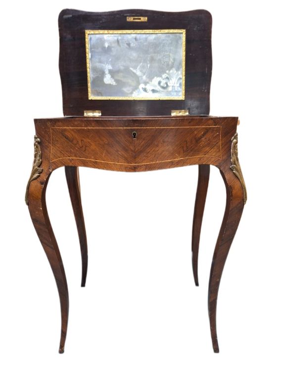 Travailleuse Napoléon III de style Louis XV en frisage et marqueterie à décor d'un bouquet de fleurs, ornementation de laiton, pieds galbés, ouvrant à un abattant à fond de glace.