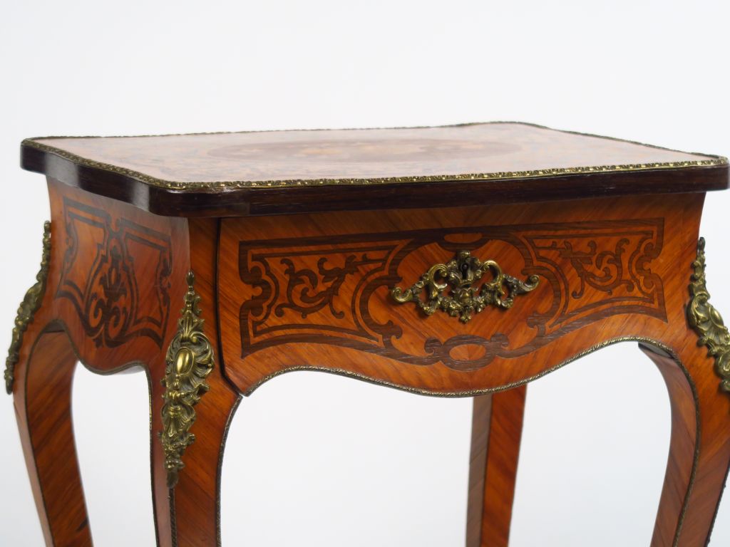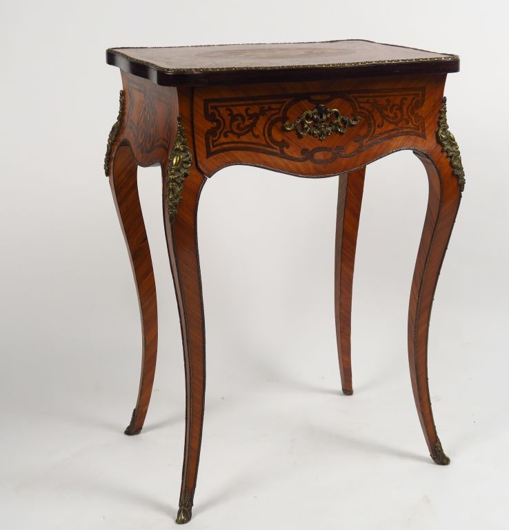 Travailleuse Napoléon III de style Louis XV en marqueterie, à décor d'un panier de fleurs et de rinceaux feuillagés. Ouvrant à un abattant et un tiroir. H.71 cm