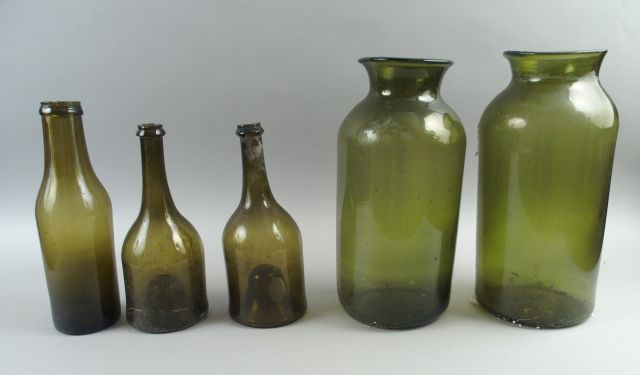 Lot de Trois bouteilles et deux bocaux en verre soufflé au prix de 60 à 80 € en vente aux enchères par l'hôtel des ventes Primardeco