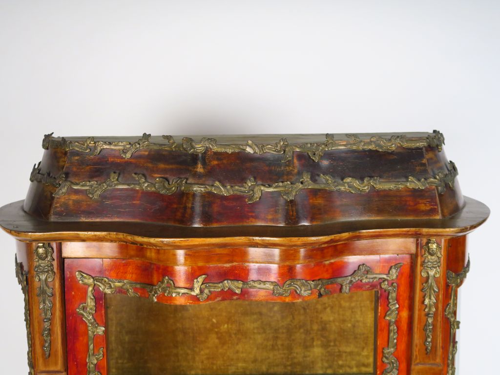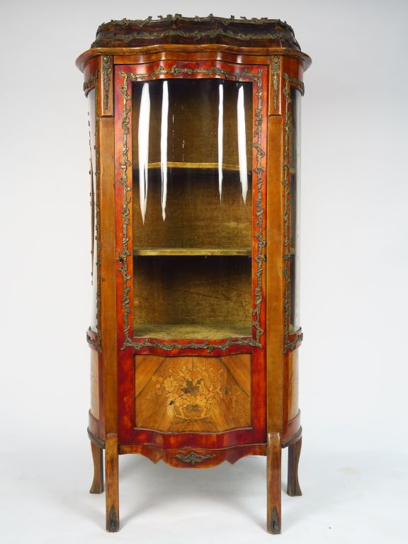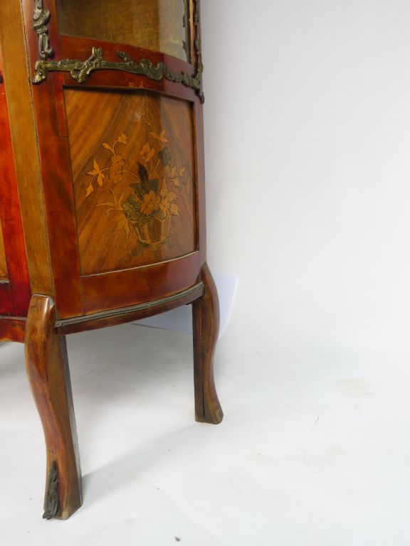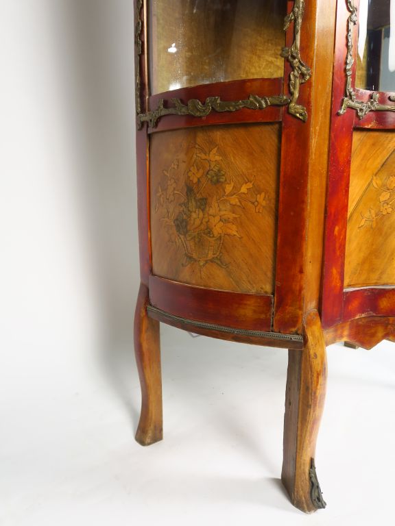 Vitrine Napoléon III de style Louis XV en marqueterie, ornementation de bronze. Ouvrant à une porte vitrée. H. 171 cm
