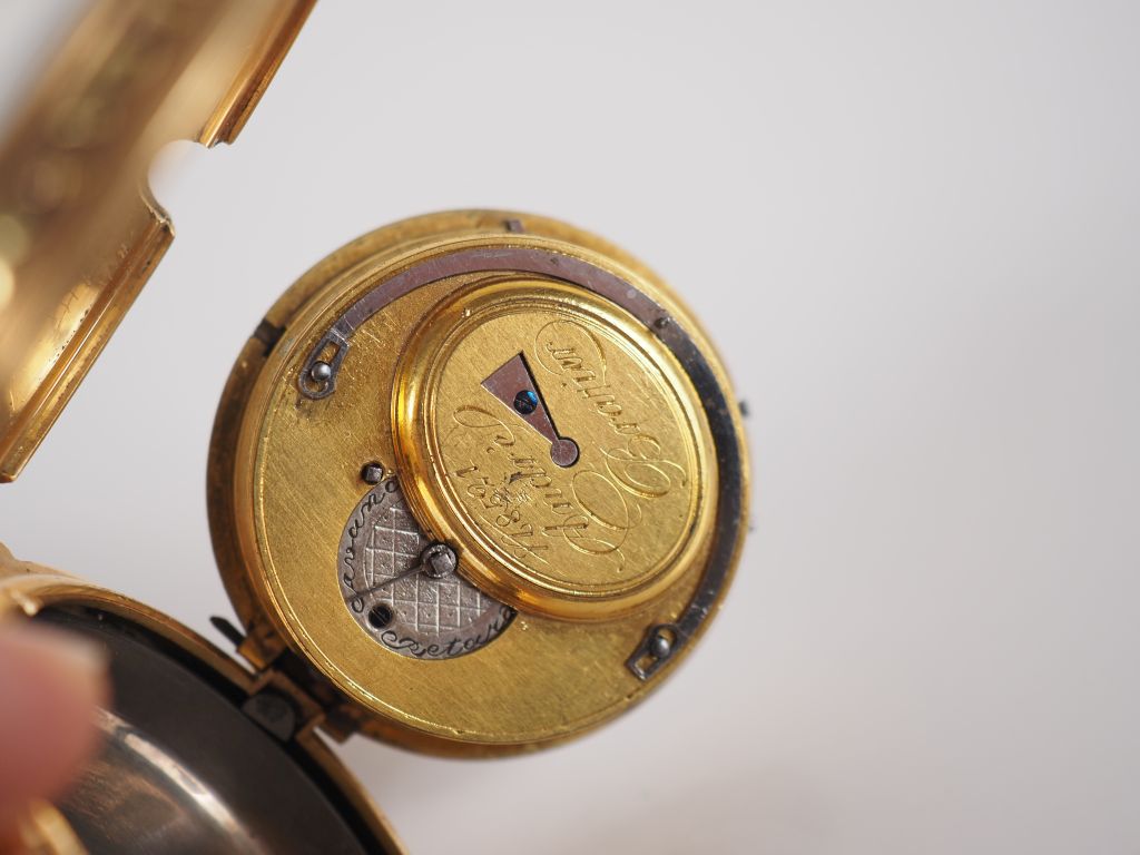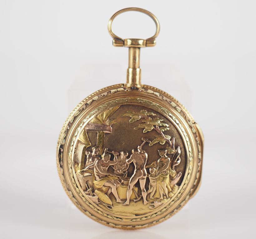 André BRAZIER N°8521 Montre de gousset en or jaune 750. Cadran à chiffres romains pour les heures et arabes pour les minutes. Le revers, à décor d'une scène de forge. Sonnerie et date quantième. Signée sur le cadran et le mécanisme. Diam.45 mm Poids tel. 88,16 g (petits cheveux au cadran)