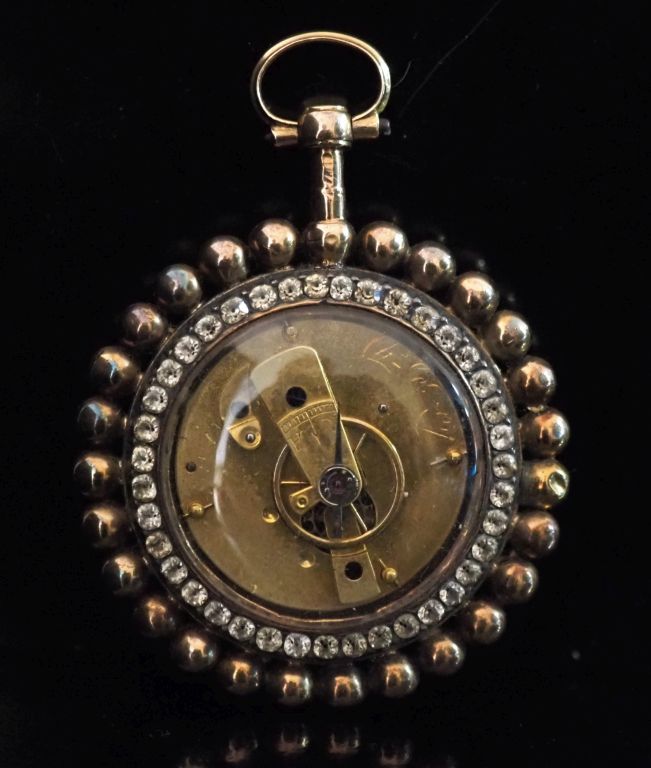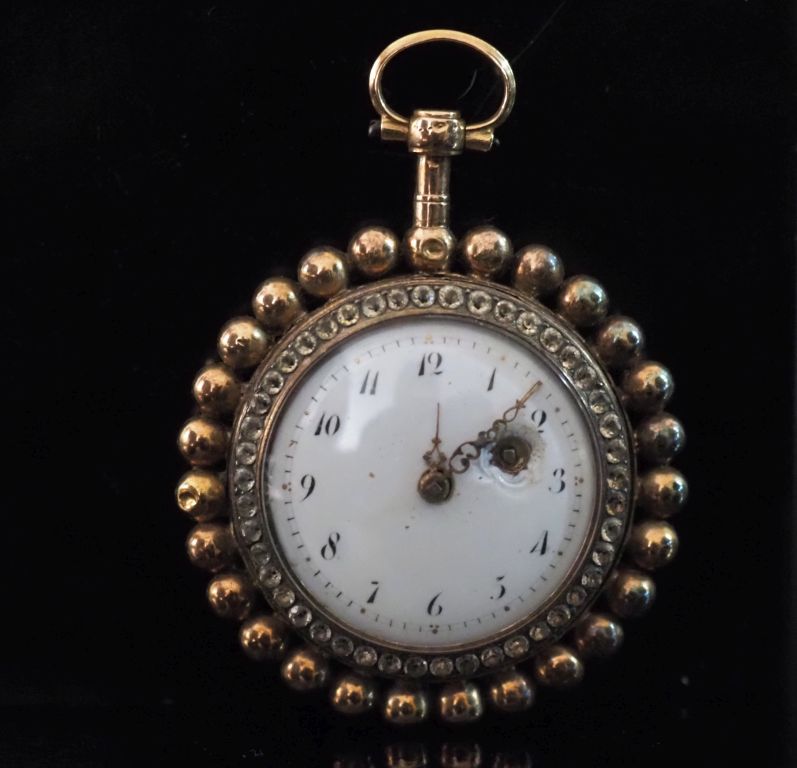 ANONYME Début XIXe siècle Montre de fantaisie en or jaune 750. Boîtier : rond sur charnière, la carrure avec des points stylisés, serti de pierres du Rhin, fond transparent (usures) Cadran : émail blanc avec chiffres arabes stylisés, minuterie chemin de fer et carré de remontage (accidents) Mouvement : mécanique avec remontage à clef Diam. 42 mm Poids tel. 40 g Expert : Geoffroy Ader - Ader Watches