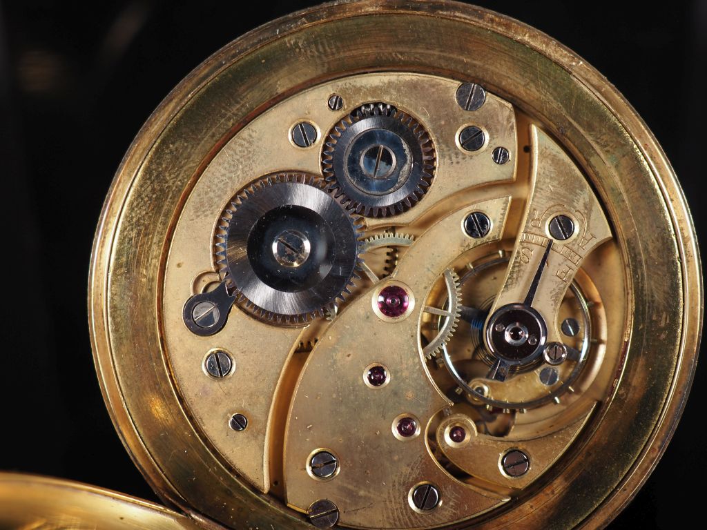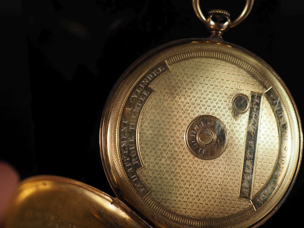 AUBERT, à Genève Montre de gousset en or jaune 750. Cadran à chiffres romains pour les heures sur un fond orné d'une lyre et de rinceaux. Double fonds en or jaune 750. Signée. Diam. 50 mm Poids tel. 71,36 g (usures)