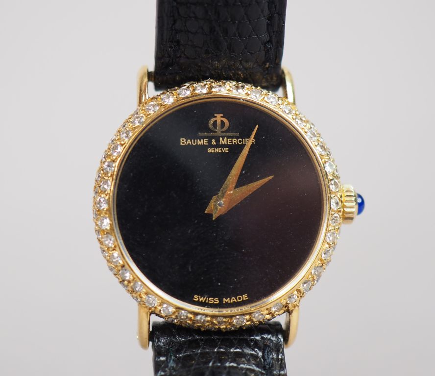 BAUME MERCIER Montre de dame, boitier en or jaune serti de petits diamants. Bracelet cuir, boucle en métal doré. Signée. 50 819629 3662 Diam. 23 mm Poids tel. 15,58 g