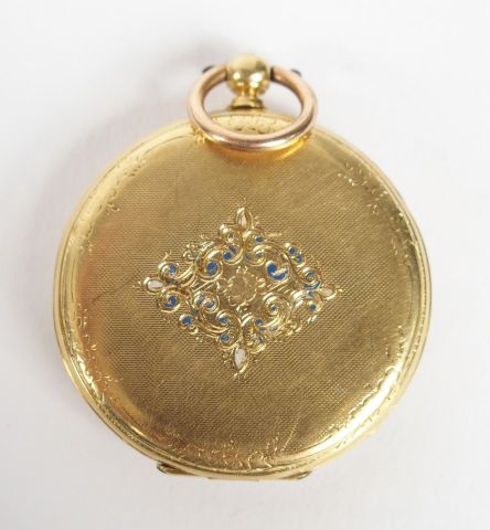 Boussard à Toulouse. Montre de col en or jaune, cadran émail, chiffres romains, décor gravé et rehaussé d'émail. Diam. : 34mm Poids tel: 24,2gr