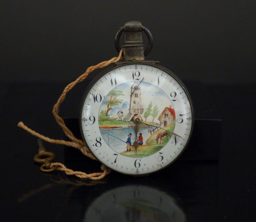 BRADSHAW RYLEY Montre de gousset en argent. Le cadran, à décor polychrome de paysage animé à la rivière. Chiffres arabes pour les heures. Trotteuse pour les secondes à 12h. Poids tel. 109.51 g