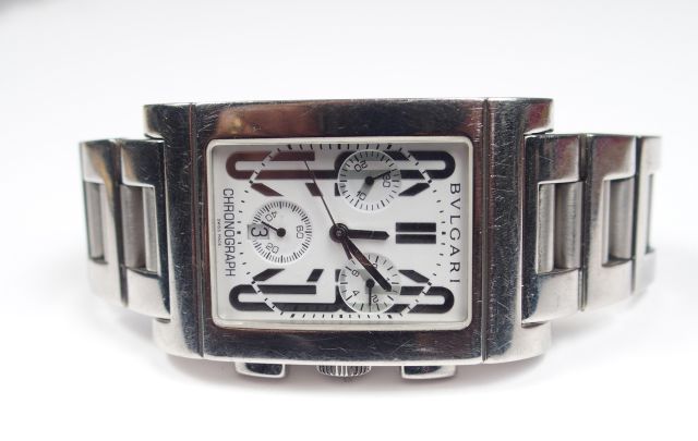 BULGARI, "Rettangolo". Montre homme, boitier et bracelet acier, fond du cadran blanc. Chronographe. 2002. Numéros de série: RTC 49 S L 3221 / JB 3.00