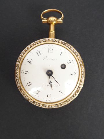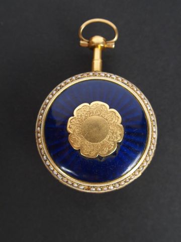 CARON à Paris (ca. XVIIIe). Montre de gousset en or jaune, décor de perles et émail bleu. Mécanisme signé Caron. (aiguille minute cassée) Poids tel: 45,6gr