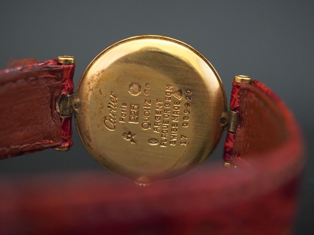 CARTIER, Must Montre bracelet de dame, boitier en argent plaqué or. Cadran rond à chiffres romains pour les heures sur fond rouge. Bracelet cuir rouge. Signée. Numérotée 17 089920. Diam. 30 mm Poids tel. 19 g environ (traces d'oxydations)