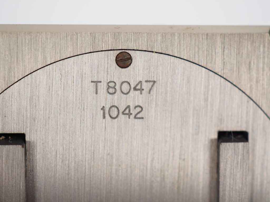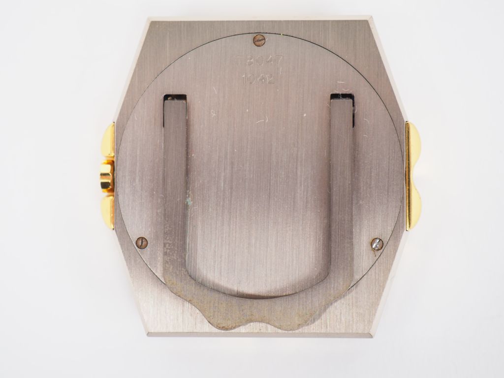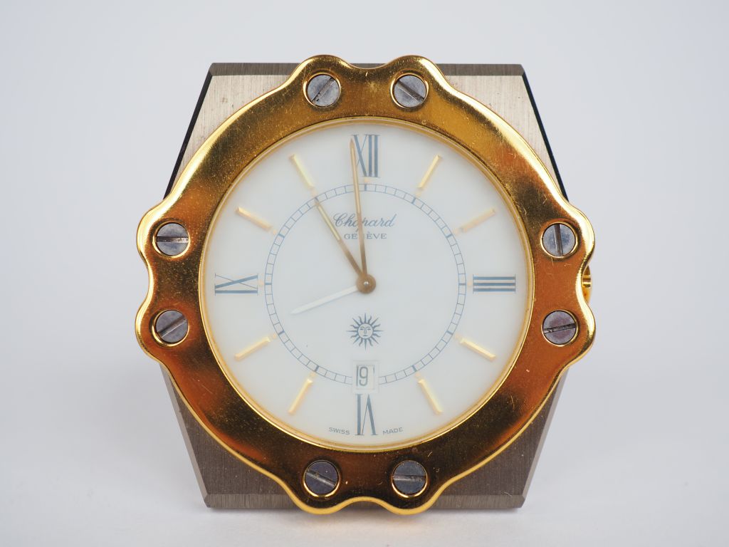 CHOPARD. Petite pendulette de table en acier. Cadran blanc à chiffres romains et index appliqués. Guichet date à 6 heures. Signée.