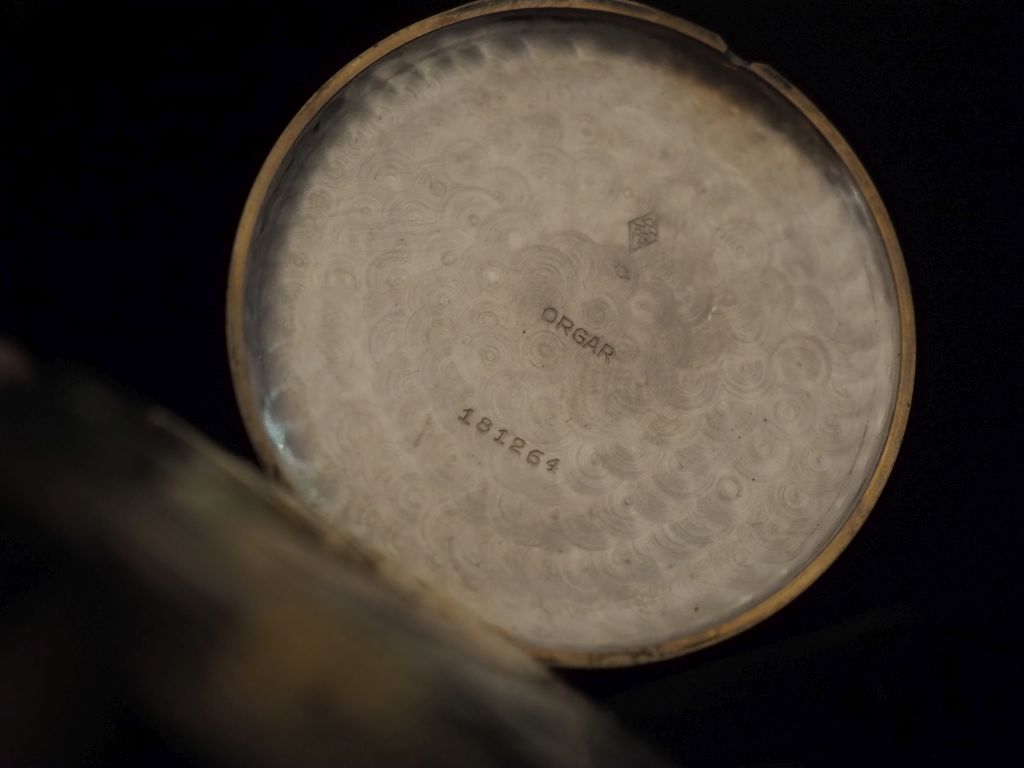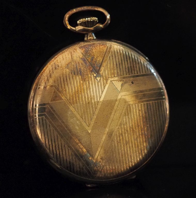 DOMINA Montre de gousset de style Art déco en or jaune 750. Cadran à chiffres arabes pour les heures sur fond champagne. Compteur pour les secondes à 6h. Aiguilles en acier bleui. Le revers, à décor de motifs géométriques. Signée sur le cadran et le mécanisme. Diam. 46 mm Poids tel. 50,33 g