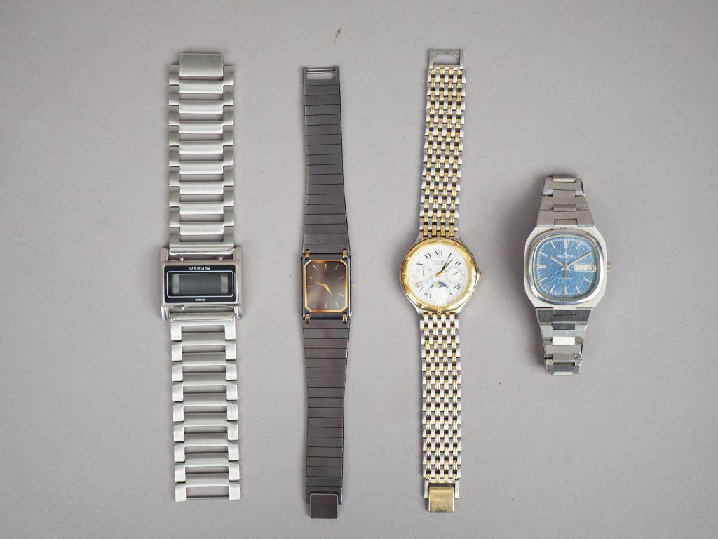 Ensemble de quatre montres, comprenant : - SEIKO. Montre, modèle Lassale. - CITIZEN. Montre d'homme en acier. Mouvement à quartz. - CASIO. Montre d'homme en acier, modèle Sheen. - HELVETIA. Montre d'homme en acier. Boitier quadrangulaire, guichet date à 3 heures. Mouvement à quartz.