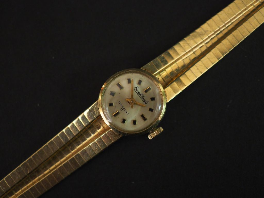 EXCELLENT Montre bracelet de dame, boitier et bracelet en or jaune 14k. Cadran rond à index batons pour les heures. Bracelet souple, maille plate. Long. 17 cm Poids tel. 27,50 g