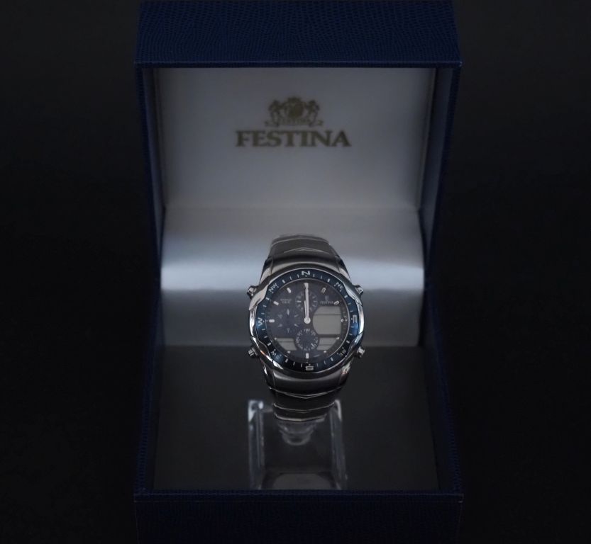 FESTINA, Multi-Chrono Montre bracelet à combinaison en acier. Cadran rond à trois sous compteurs, affichage numérique, index appliqués, aiguilles luminescentes. Lunette graduée. Bracelet acier à boucle déployante. Signée. Diam. 43 mm Dans sa boite. (bracelet non signé probablement rapporté)