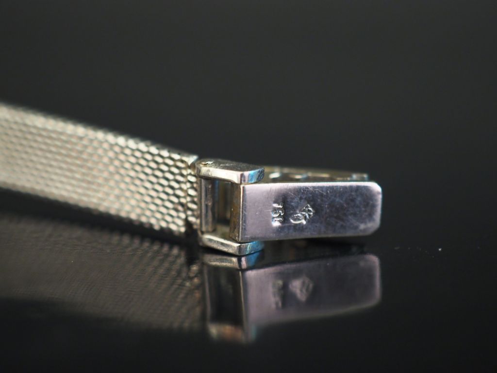 FLAMOR Montre bracelet de dame, boitier et bracelet en or blanc. Cadran ovale serti de pierres à l'imitation du diamant, index bâtons pour les heures. Bracelet souple, maille plate. Signée. Long. 16,5 cm Poids tel. 31,67 g
