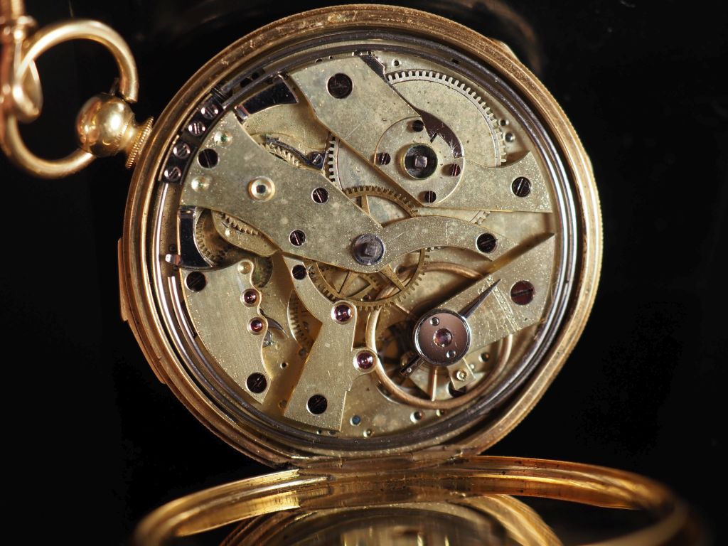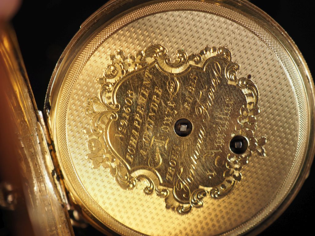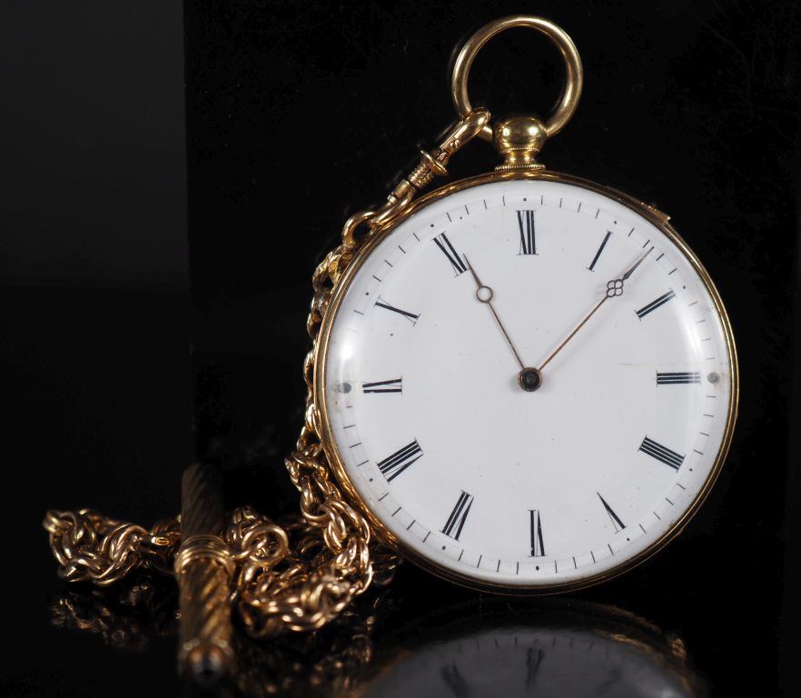 FONTANA Frères, à Aurillac Montre de gousset en or jaune 750 et sa giletière (et sa clé) en or jaune 750, maille entrelacée. Cadran émaillé à chiffres romains pour les heures. Le revers, à décor gravé de fleurs et feuillage. Double fonds en or jaune 750. Signée. Diam. 48 mm Poids tel. de la montre : 66,28 g Poids tel. de la giletière avec la clé de montre : 13,06 g (petits accidents au cadran)