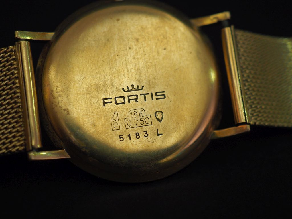 FORTIS Montre bracelet d'homme, boitier et bracelet en or jaune. Cadran rond à index batons pour les heures. Bracelet souple, maille plate tressée. Long. 17,5 cm Diam. 35 mm Poids tel. 60,54 g (petites rayures au verre)