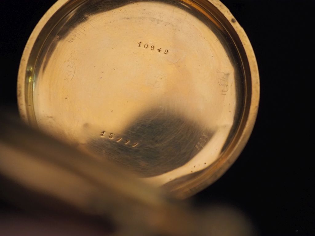 GENEVE Montre de gousset en or jaune 750. Cadran à chiffres romains pour les heures et arabes pour les minutes. Compteur pour les secondes à 6h. Double fonds en or jaune 750. Ancre spiral Bréguet. Numérotée. Diam. 50 mm Poids tel. 83,57 g (verre rayé)