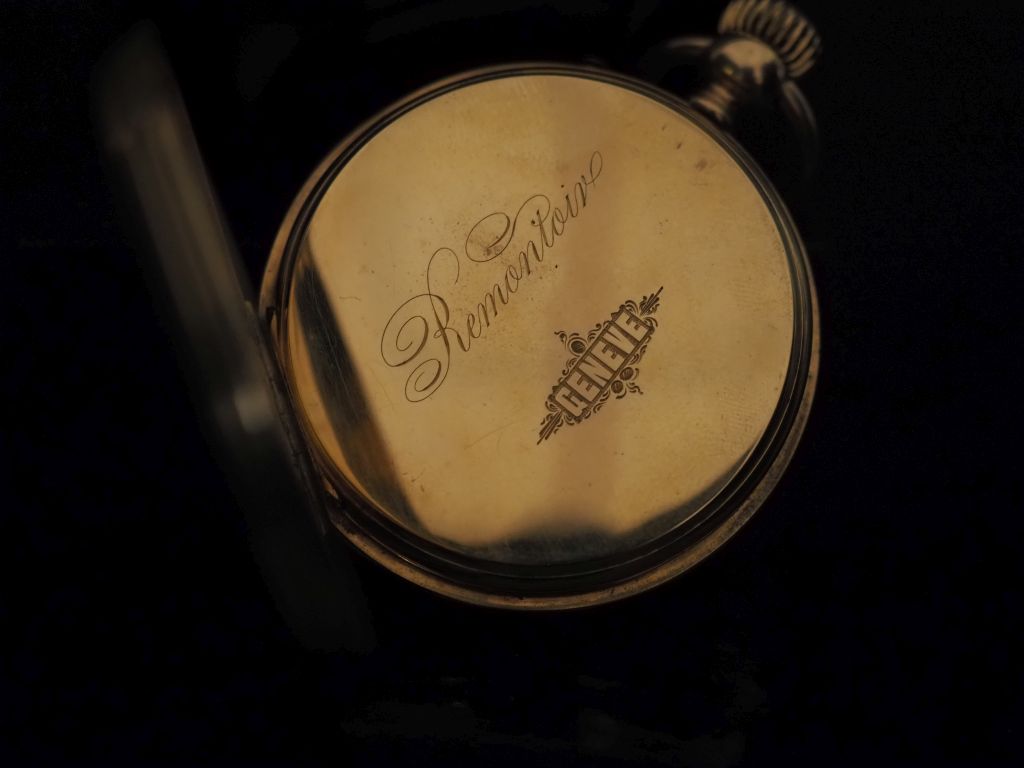 GENEVE Montre de gousset en or jaune 750. Cadran à chiffres romains pour les heures et arabes pour les minutes. Compteur pour les secondes à 6h. Le revers, à décor de médaillon monogrammé sur fond guilloché. Double fonds en or jaune 750. Numérotée 3569. Diam. 48 mm Poids tel. 79,55 g (petits cheveux au cadran)