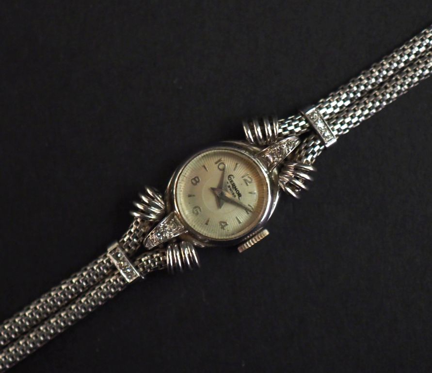 GERMOR Montre bracelet de dame, boitier et bracelet en or blanc. Cadran rond à chiffres arabes et index batons pour les heures. Le cadran et le bracelet agrémentés de petits diamants de part et d'autre. Bracelet souplee double rangs, maille dite "tubogaz". Signée sur le cadran. Long. 16 cm Poids tel. 21,62 g