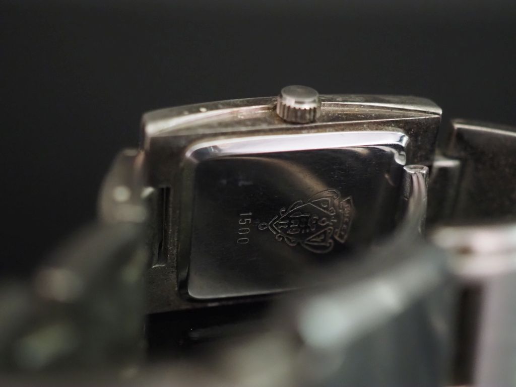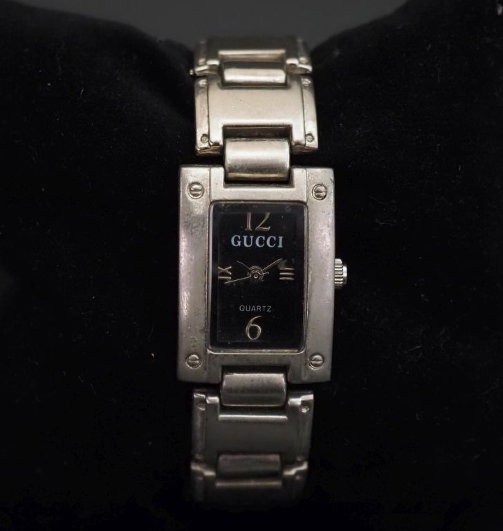 GUCCI, Montre bracelet de dame en acier. Cadran rectangulaire à fond noir, chiffres arabes et romains pour les heures. Bracelet articulé, boucle déployante. Signée. Numérotée au dos 1500. 28 x 20 mm (petites usures)