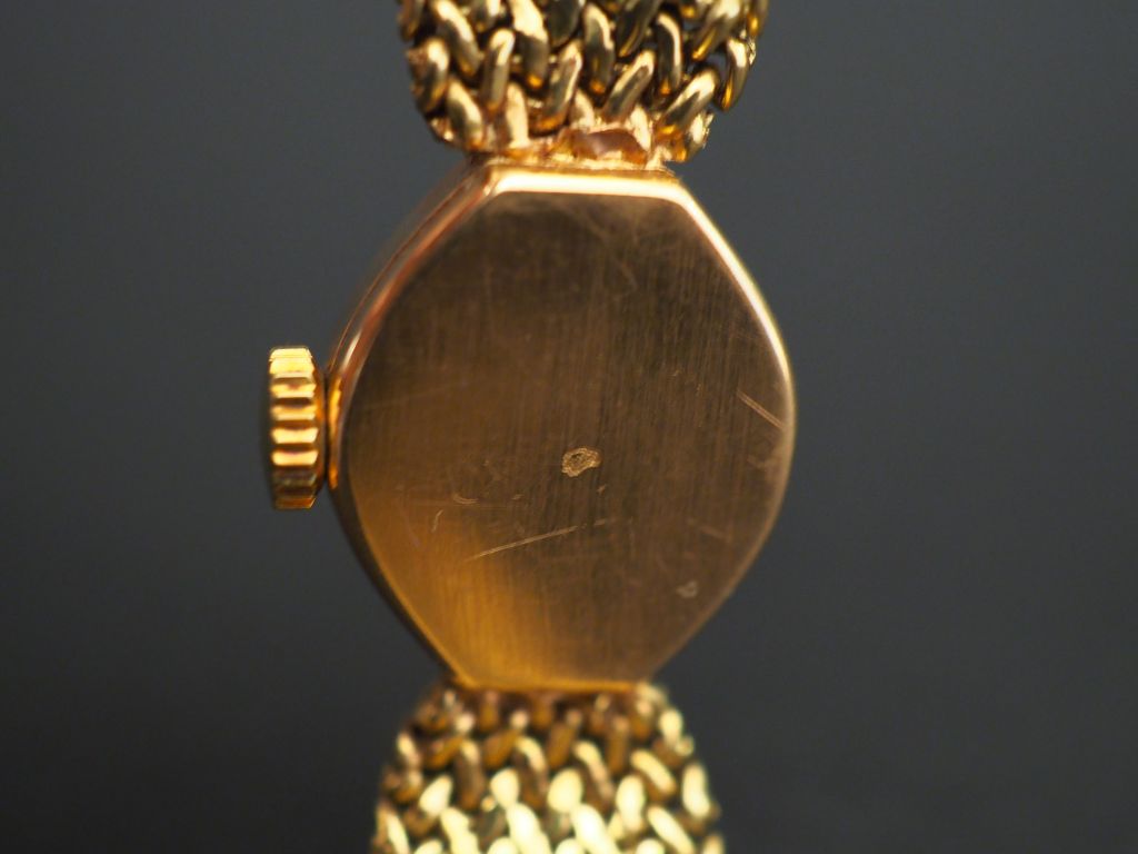 HUMA Montre bracelet de dame, boitier et bracelet or jaune. Cadran rond à index batons pour les heures. Bracelet souple, maille plate tressée. Signée sur le cadran. Long. 16 cm Poids tel. 29,35 g