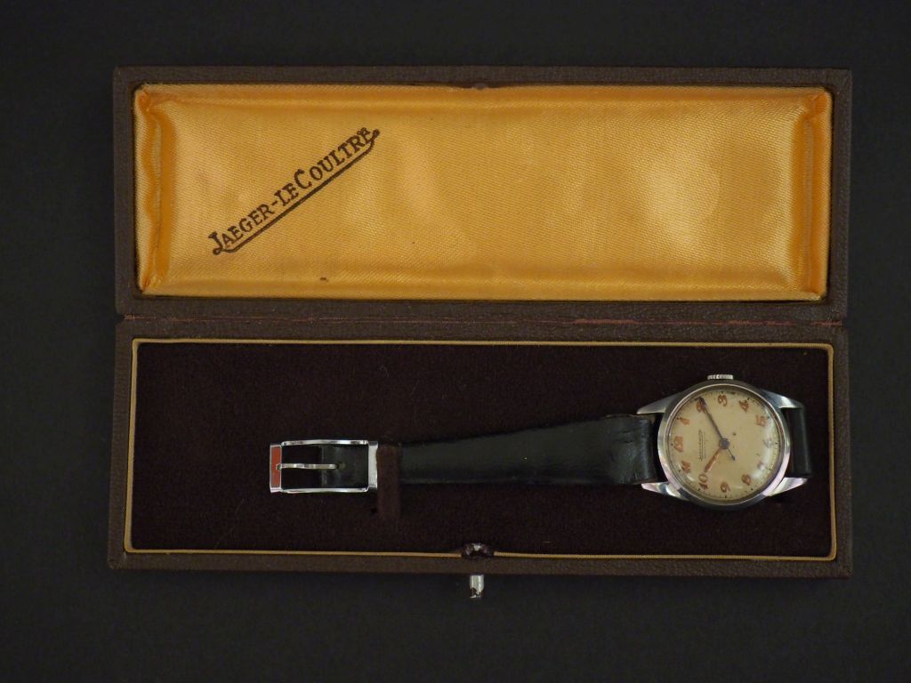 JAEGER LECOULTRE Montre bracelet en acier. Cadran rond à chiffres arabes pour les heures. Bracelet cuir noir, boucle ardillon. Signée sur le cadran et le mécanisme. Numérotée au revers du boitier 425173 et sur le mécanisme 542645. Diam. 25 mm Dans son écrin. (bracelet usé, cadran légèrement taché)